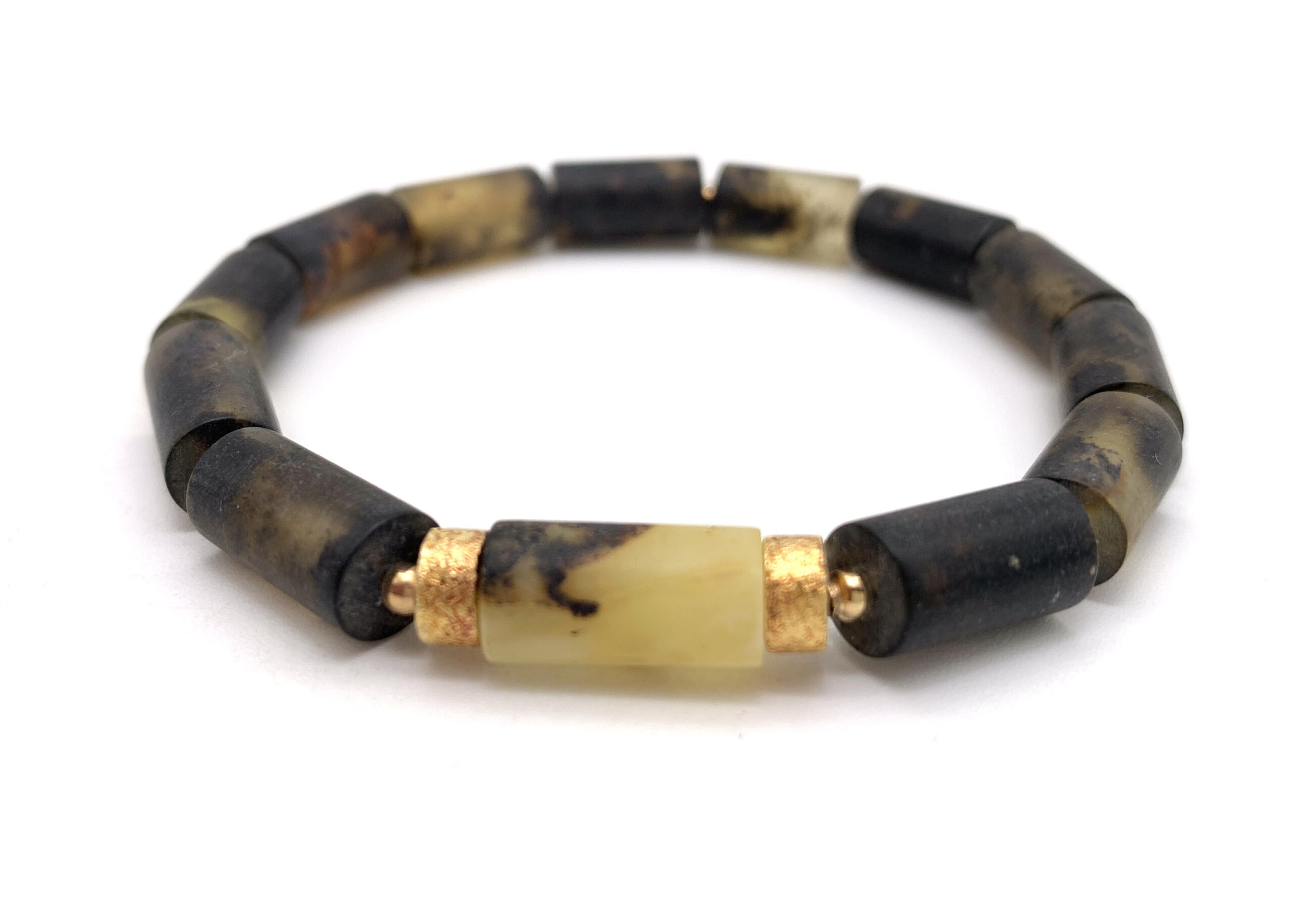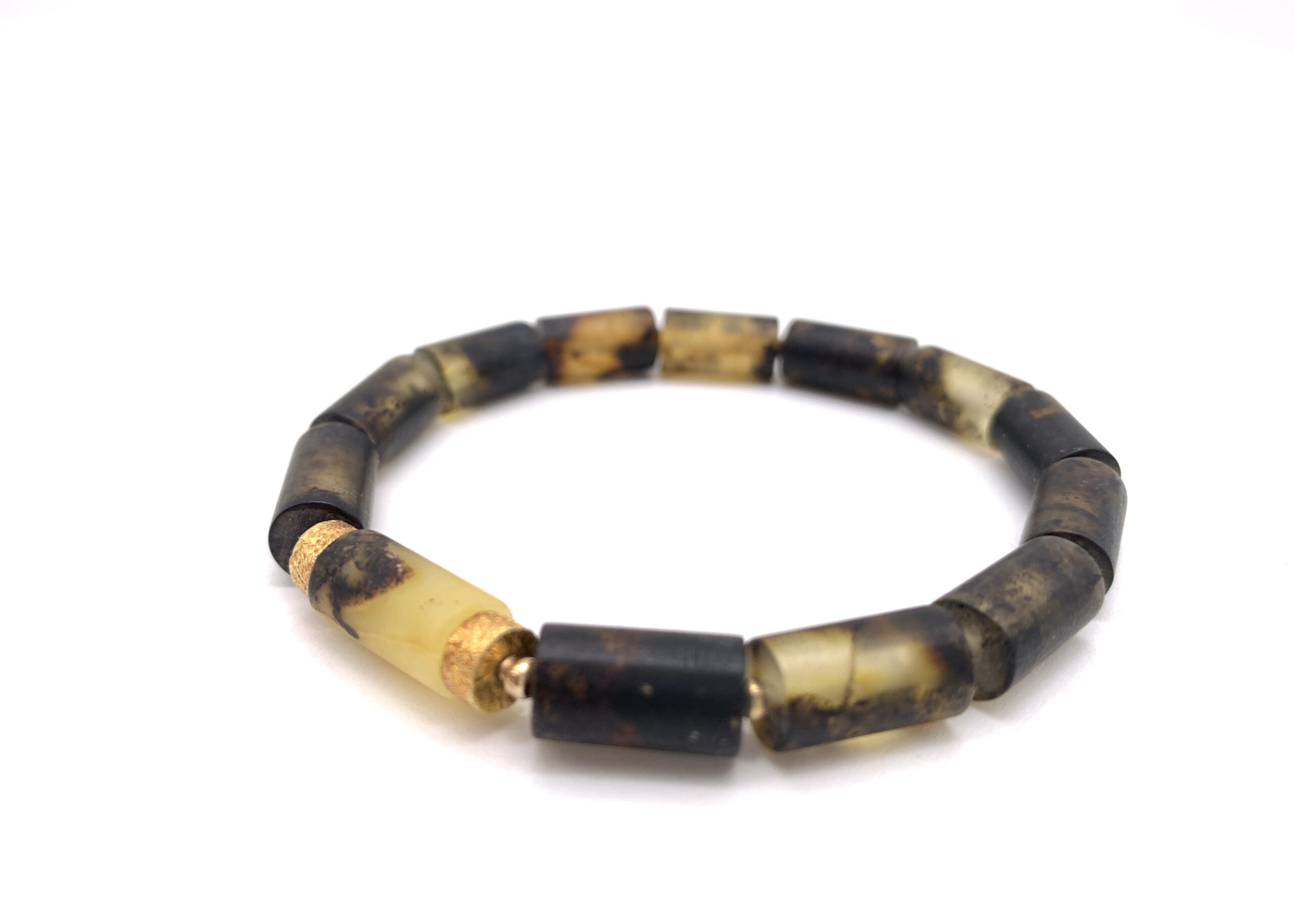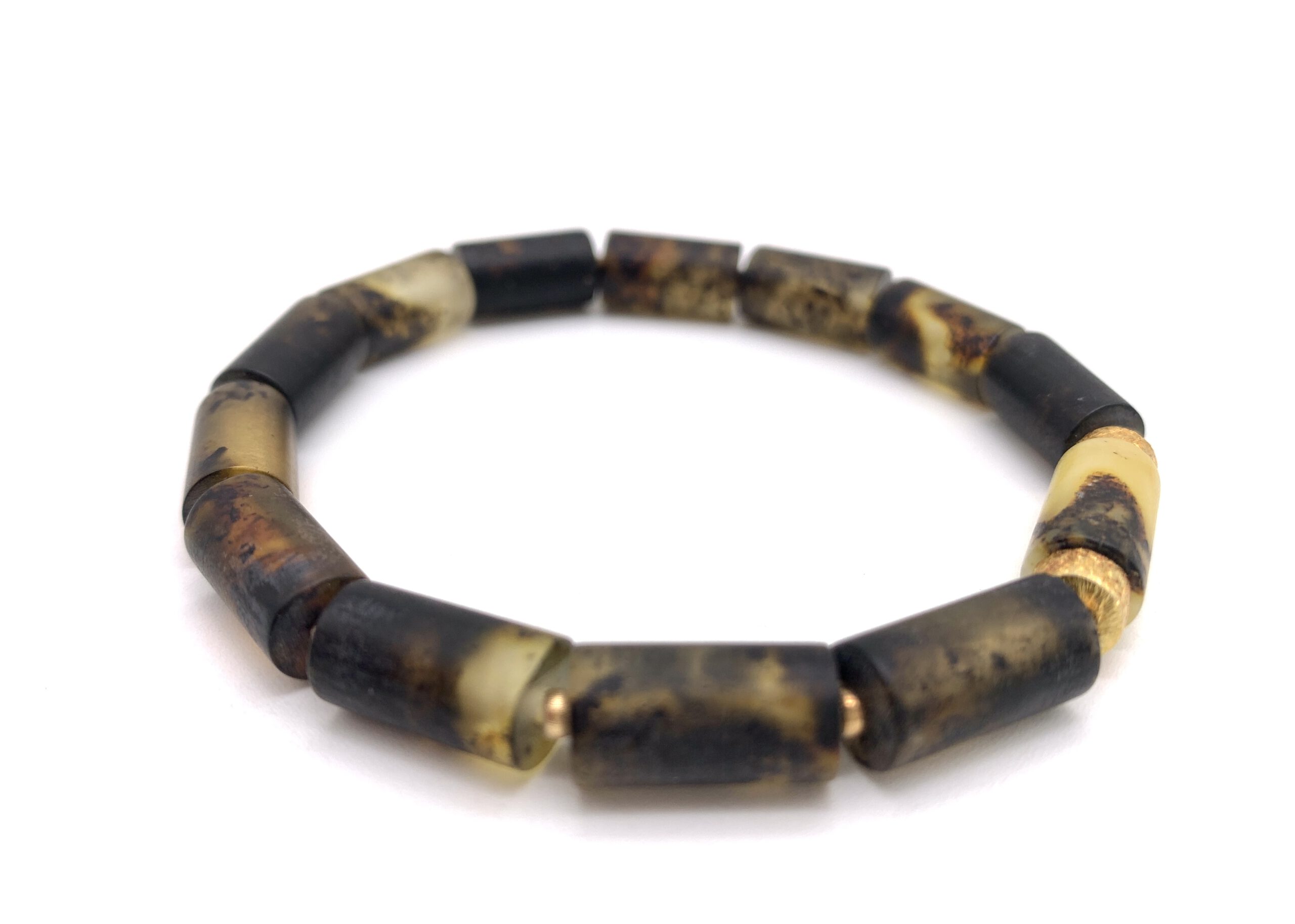 Dieses Bernstein Armband besteht aus zylindrisch geschliffenem baltischem Bernstein, der nicht poliert ist und dadurch seine natürliche, matte Oberfläche bewahrt. Die hellen und dunkleren Farbnuancen sowie organische Einschlüsse machen jedes Bernstein Armband zu einem Unikat.