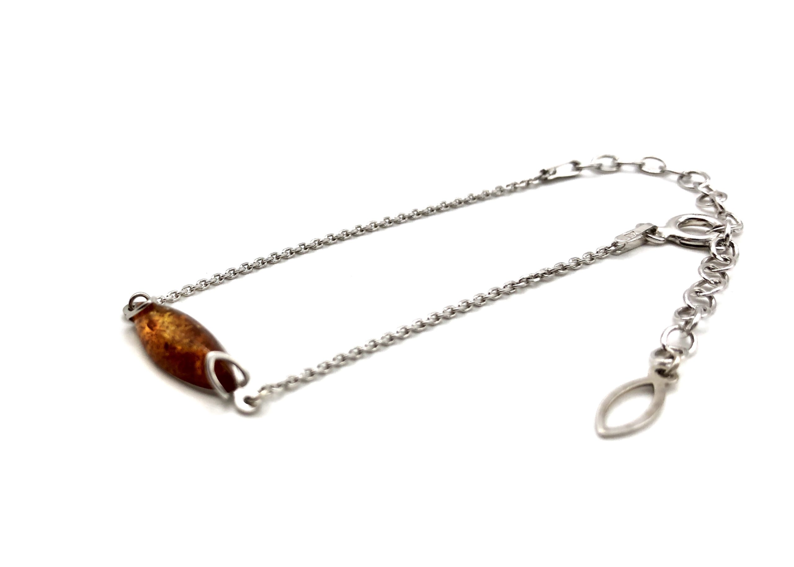 Schliches, leichtes Armband für jeden Tag! Durch das minimalistische Design passt perfekt zu jedem Outfit. Reiskornförmiger Bernstein auf einem silbernen Element aus 925er Silber. Auf der Rückseite befindet sich eine kleine Gravur.