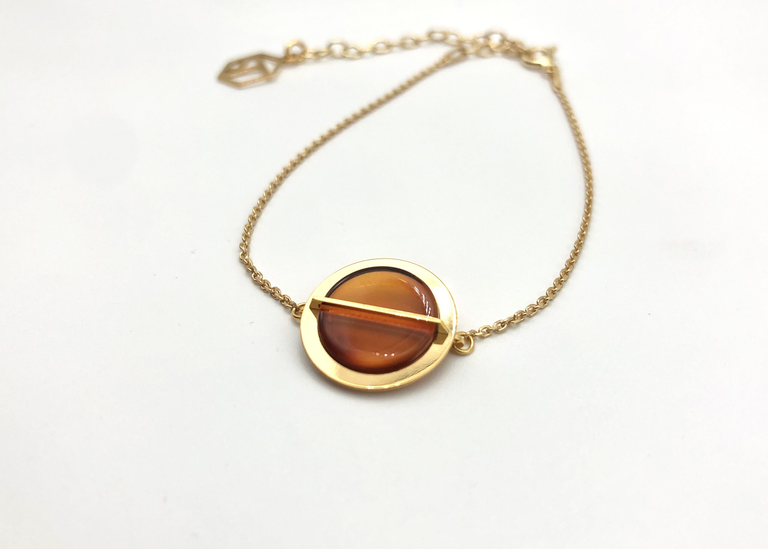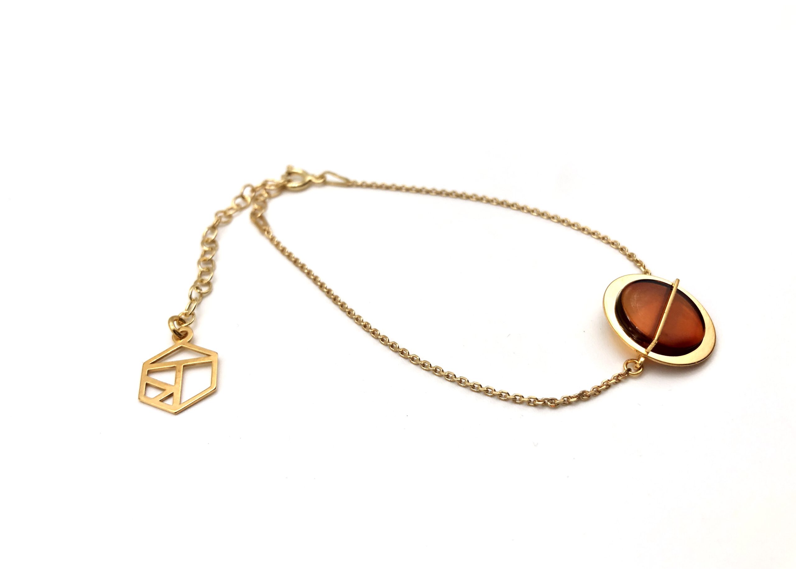 Ein Kreisförmiges Bernsteinplättchen wurde in vergoldetem Silber gefasst. Das warme Gold ergänzt sich gut mit dem Bernstein in Cognac. Das Armband wird dich jeden Tag begleiten und ganz bestimmt zu deinem Lieblingsstück werden.
