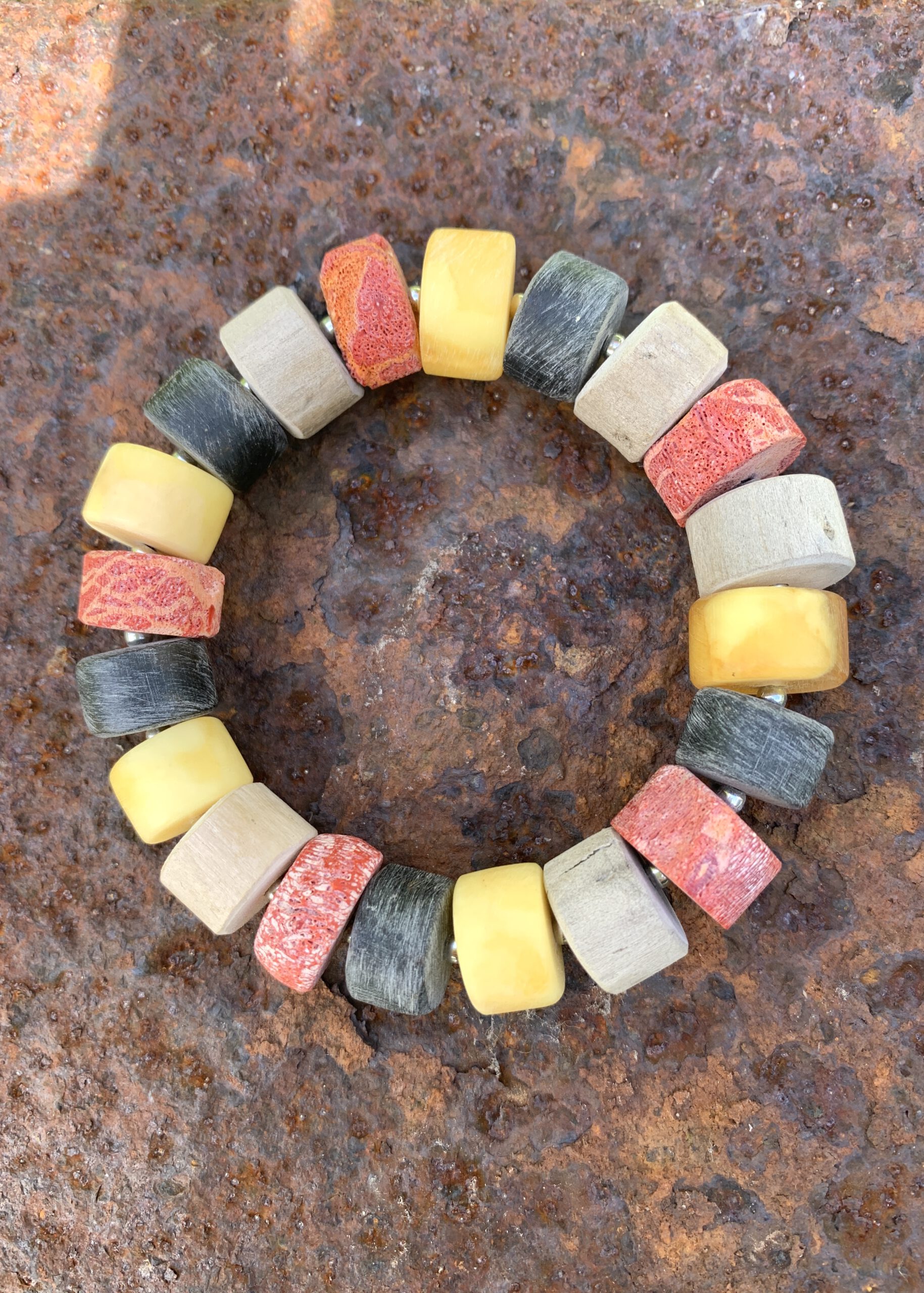 Diese einzigartige Kombination aus Materialien und Farben macht das Armband zu einem echten Blickfang und verleiht Ihrem Outfit einen Hauch von Natürlichkeit und Originalität.