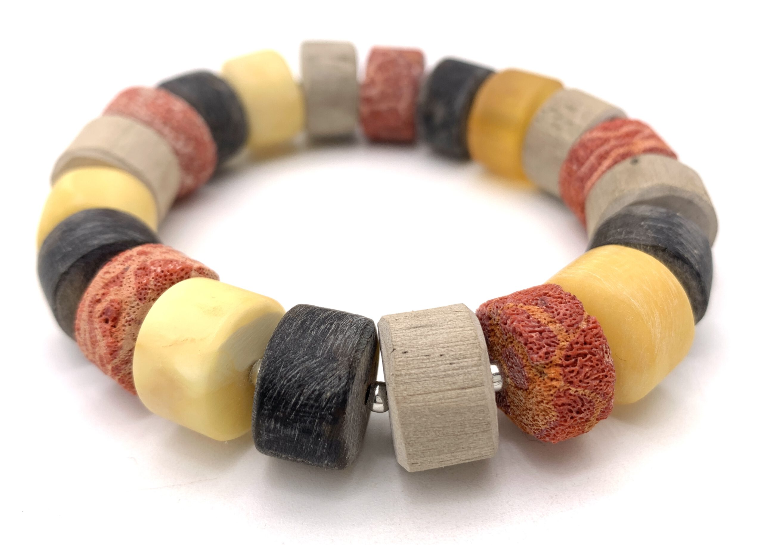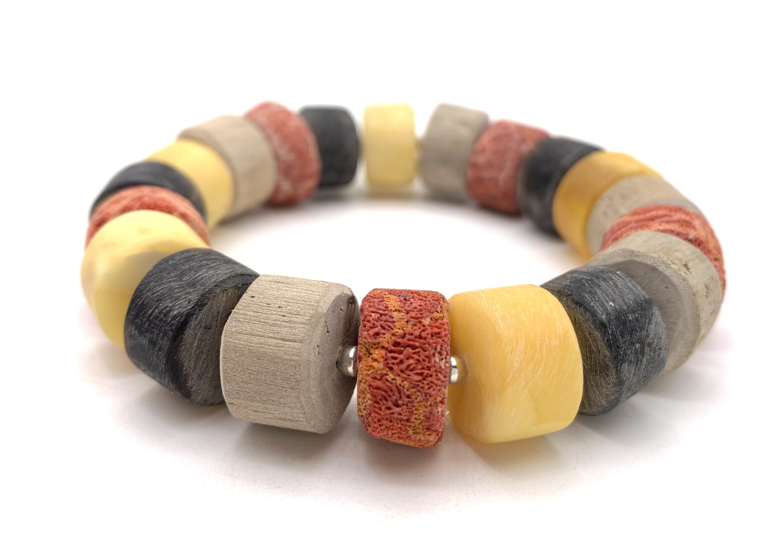 Dieses einzigartige Bernstein Armband vereint die natürliche Schönheit von ungeschliffenem, schwarzem und hellem baltischem Bernstein mit der Eleganz von Treibholz. Die roten, matten Schaumkorallen-Scheiben verleihen ihm einen besonderen Farbakzent und und auffälligen Look, der perfekt zu Ihrem individuellen Stil passt.