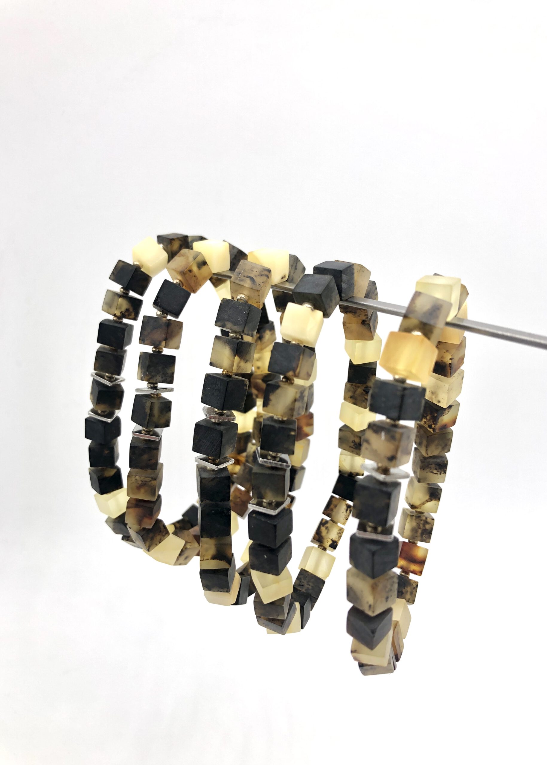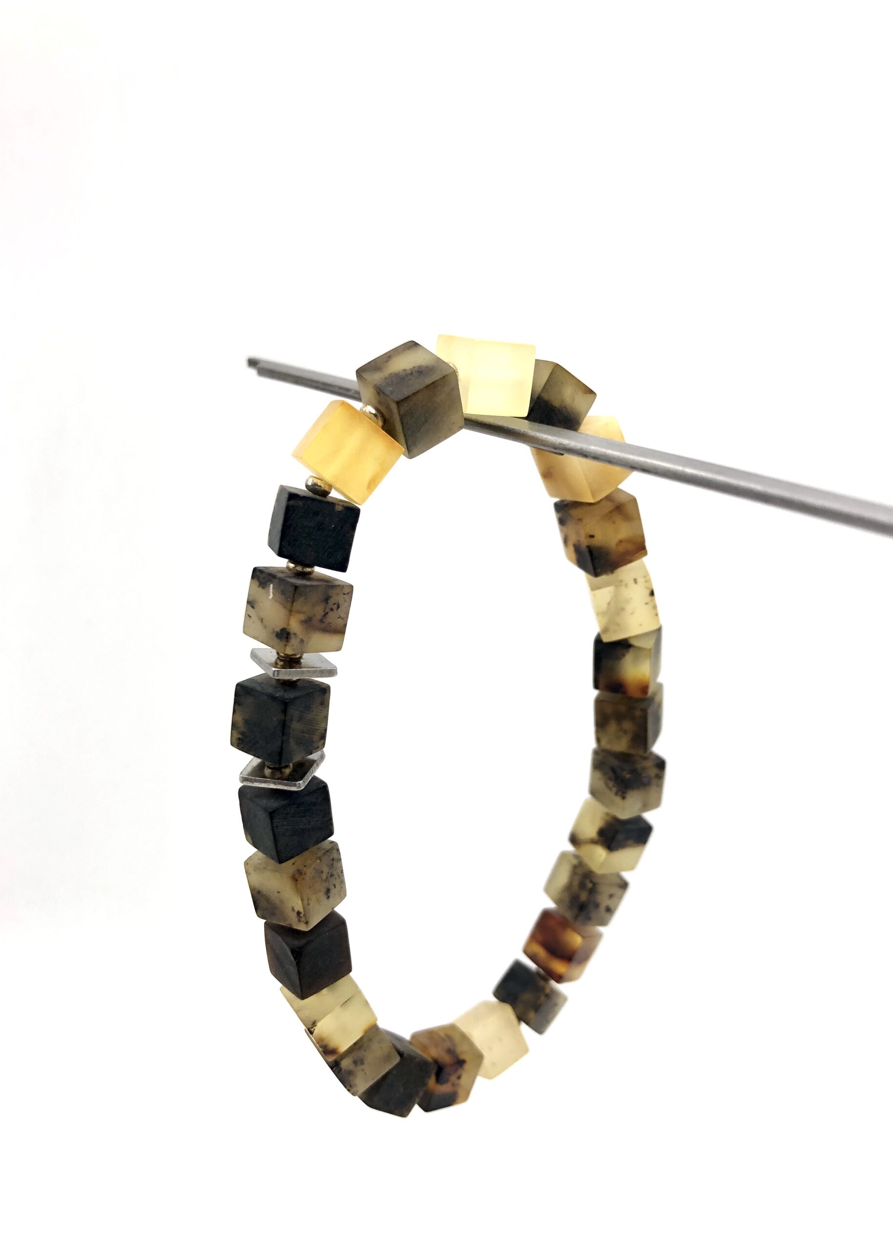 Zwischen den einzelnen Bernsteinwürfeln befinden sich ebenfalls kleine silberne Kugeln.
