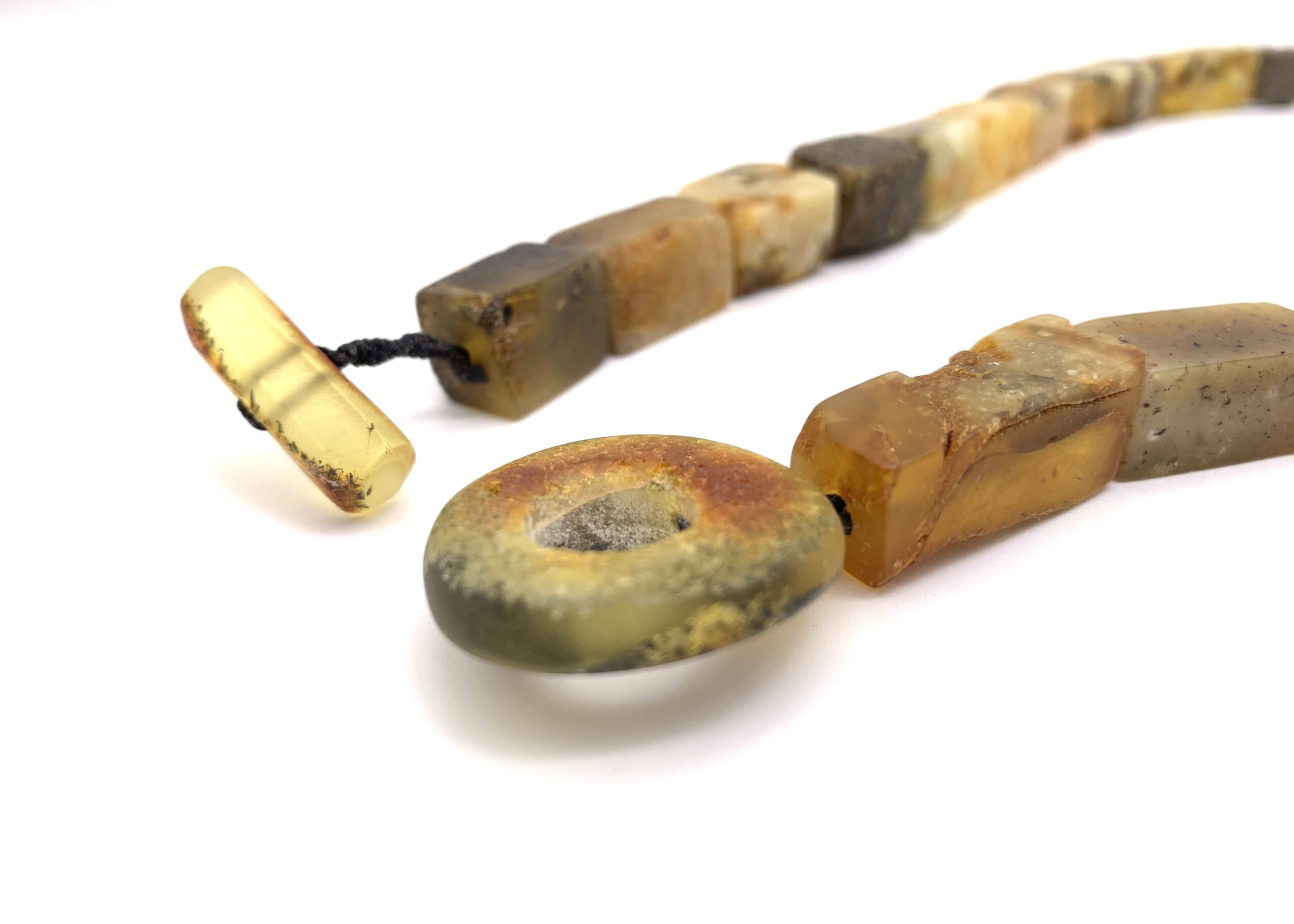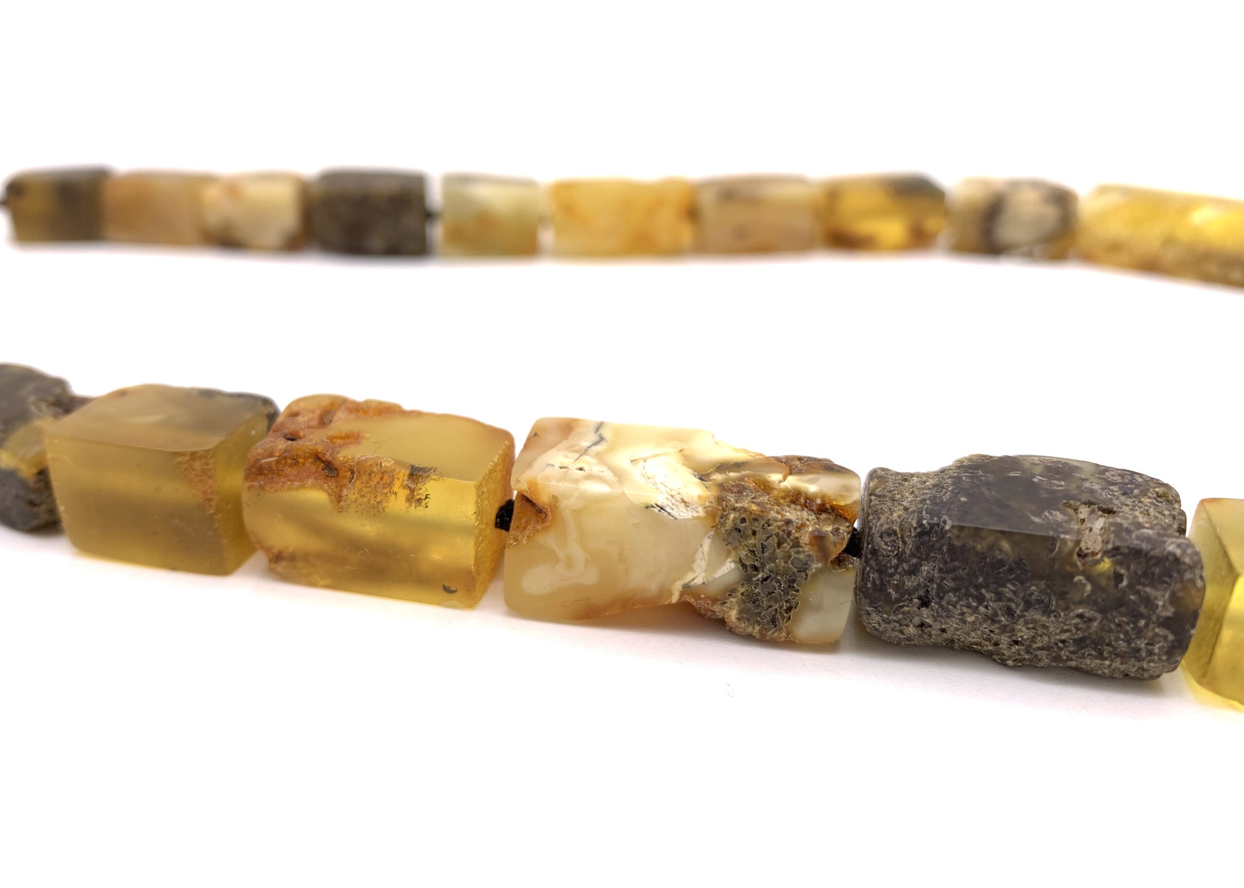 Diese Bernstein Kette besteht aus baltischem Naturbernstein in unpolierter, matter Optik. Unregelmäßig geschnittene Quader und Bruchstücke ergeben ein lebendiges Mosaik aus Butterscotch-, Honig- und Erdtönen – teils durchscheinend, teils opak, mit natürlicher Rinde und Einschlüssen. Das Highlight ist die Schließe aus Bernstein, die die Form der Steine aufgreift und das Design metallfrei & pur abschließt. Diese kann man entweder klassisch hinten, vorne oder auch seitlich tragen.