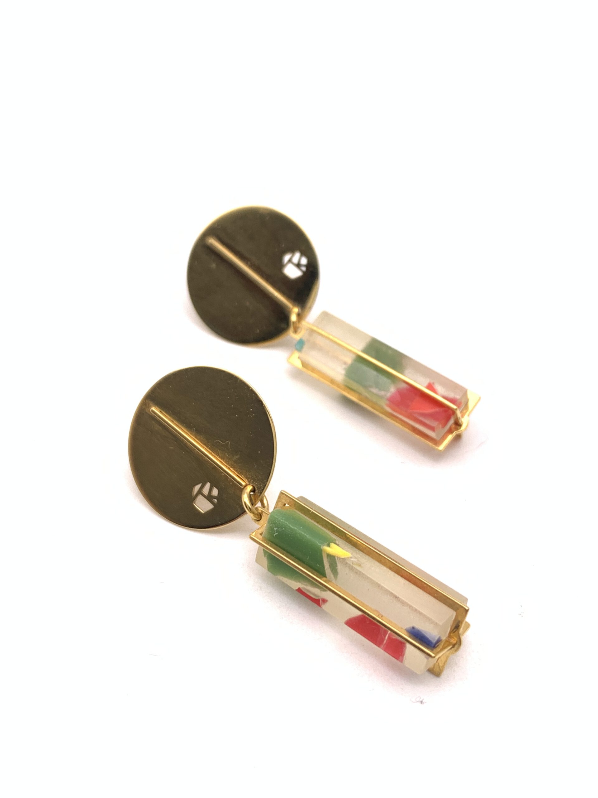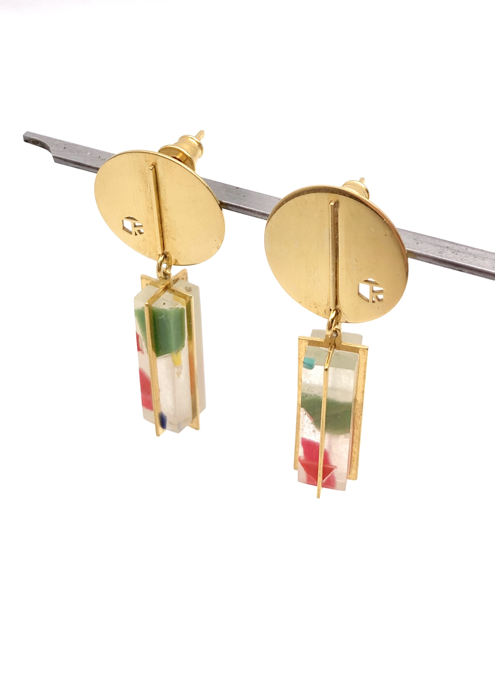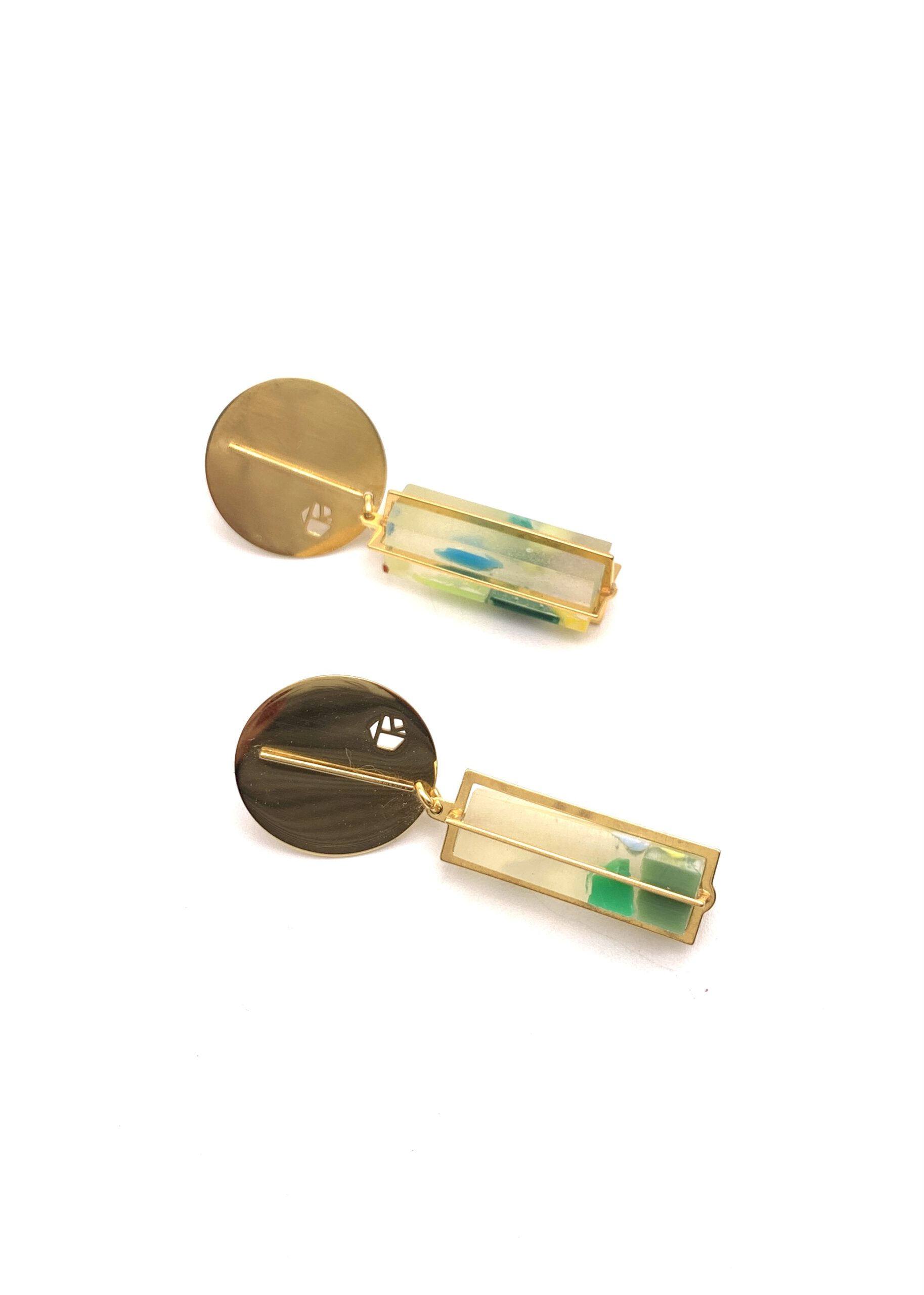 Das zentrale rechteckige Element aus Terrazzo ist besonders faszinierend. Dieses innovative Material, das recycelten Kunststoff und baltischen Bernstein kombiniert, hebt die Ohrringe von herkömmlichen Schmuckstücken ab. Die Mischung aus modernen und traditionellen Materialien zeigt eine gelungene Verbindung von Nachhaltigkeit und Eleganz. Dass das Material zudem robust und langlebig ist, macht es zu einer idealen Wahl für hochwertigen Schmuck.