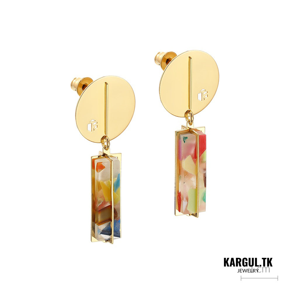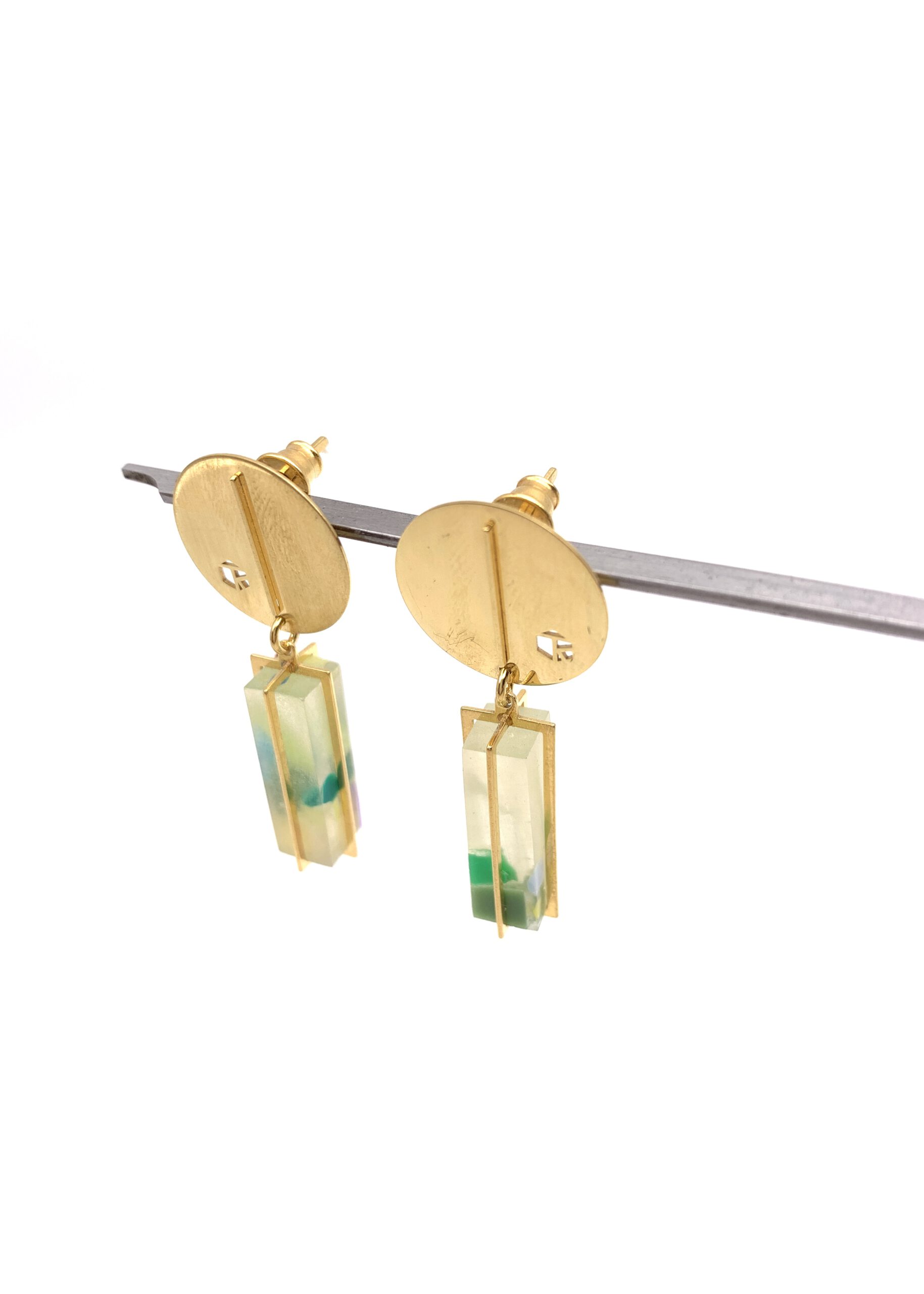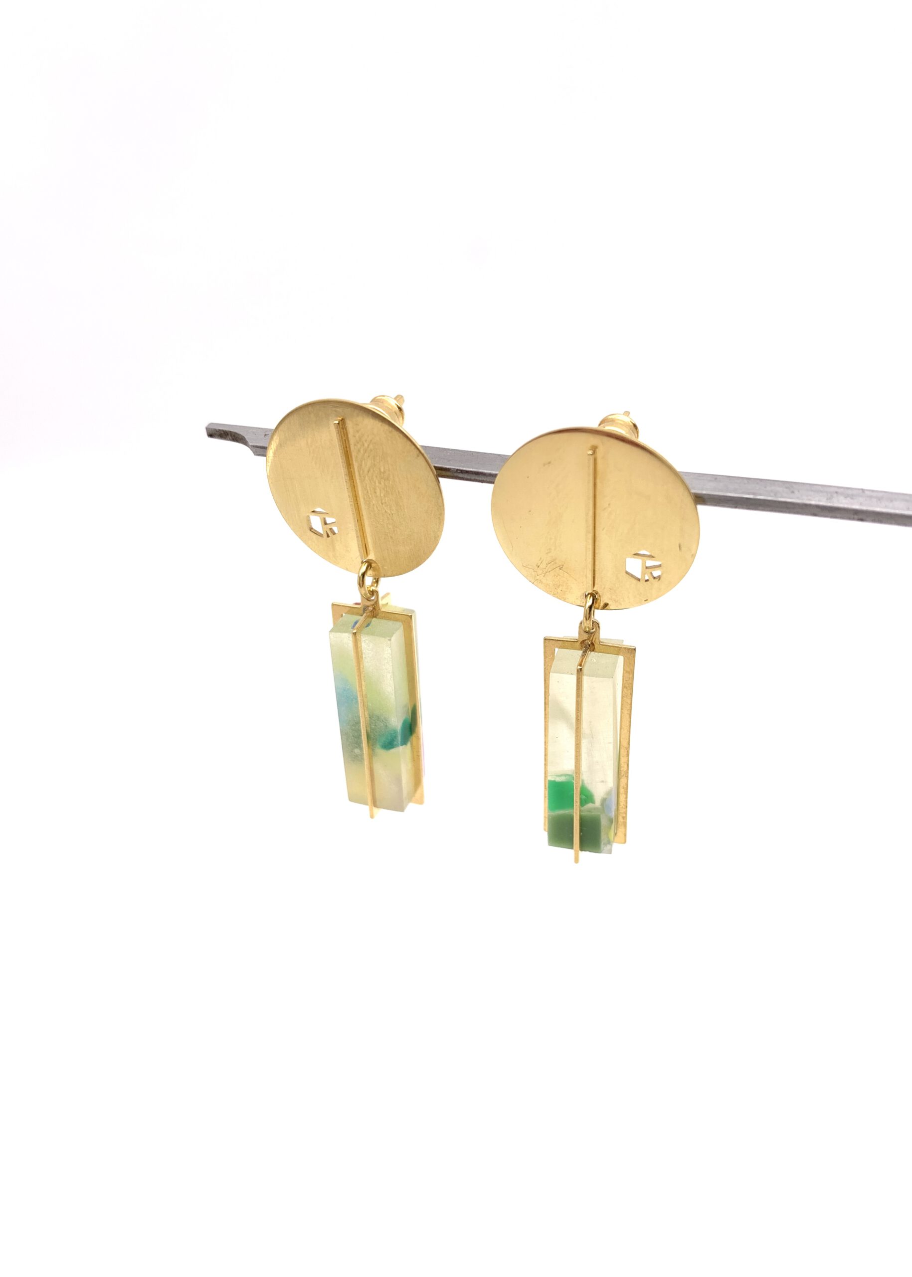 Das zentrale rechteckige Element aus Terrazzo ist besonders faszinierend. Dieses innovative Material, das recycelten Kunststoff und baltischen Bernstein kombiniert, hebt die Ohrringe von herkömmlichen Schmuckstücken ab. Die Mischung aus modernen und traditionellen Materialien zeigt eine gelungene Verbindung von Nachhaltigkeit und Eleganz. Dass das Material zudem robust und langlebig ist, macht es zu einer idealen Wahl für hochwertigen Schmuck.