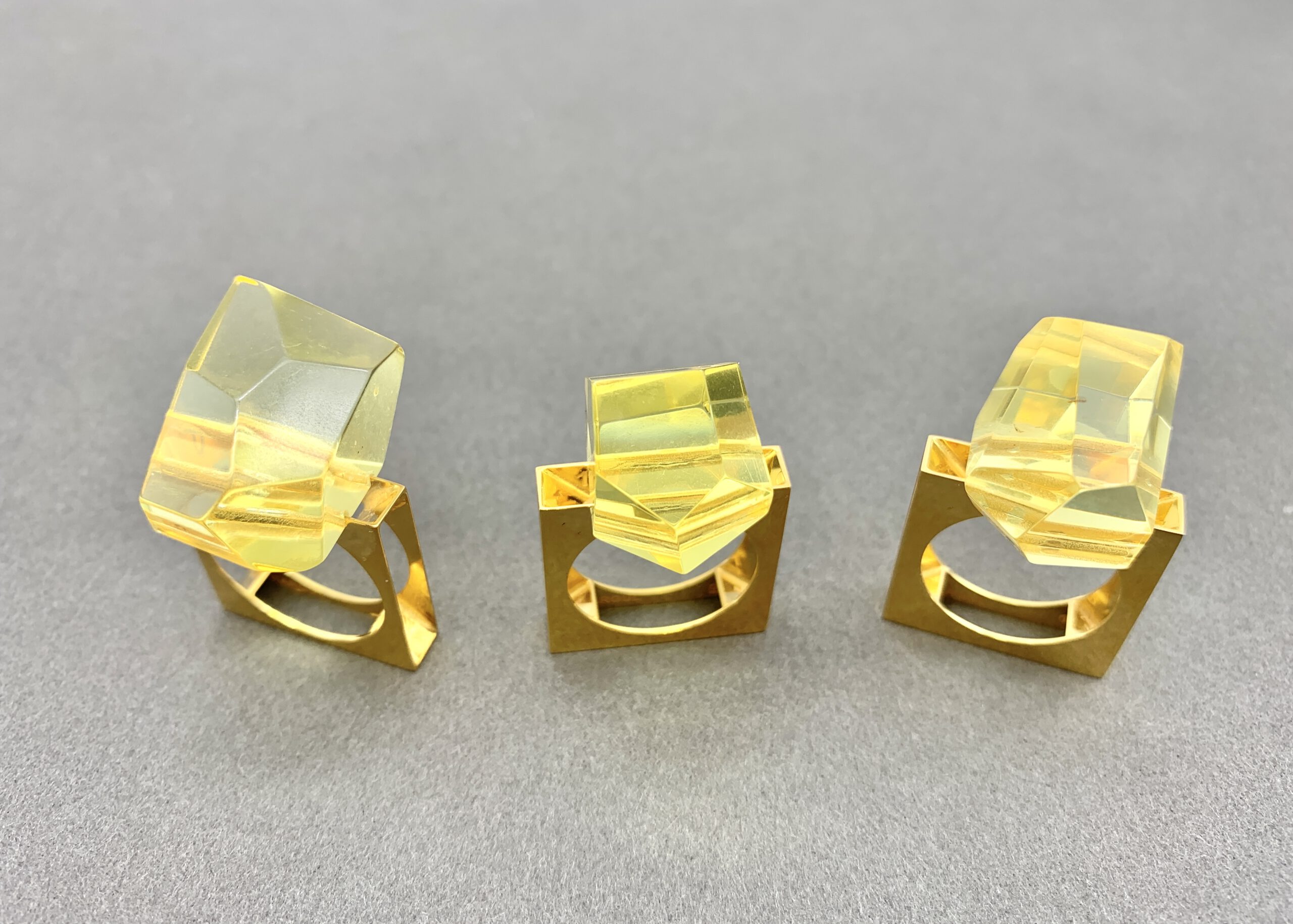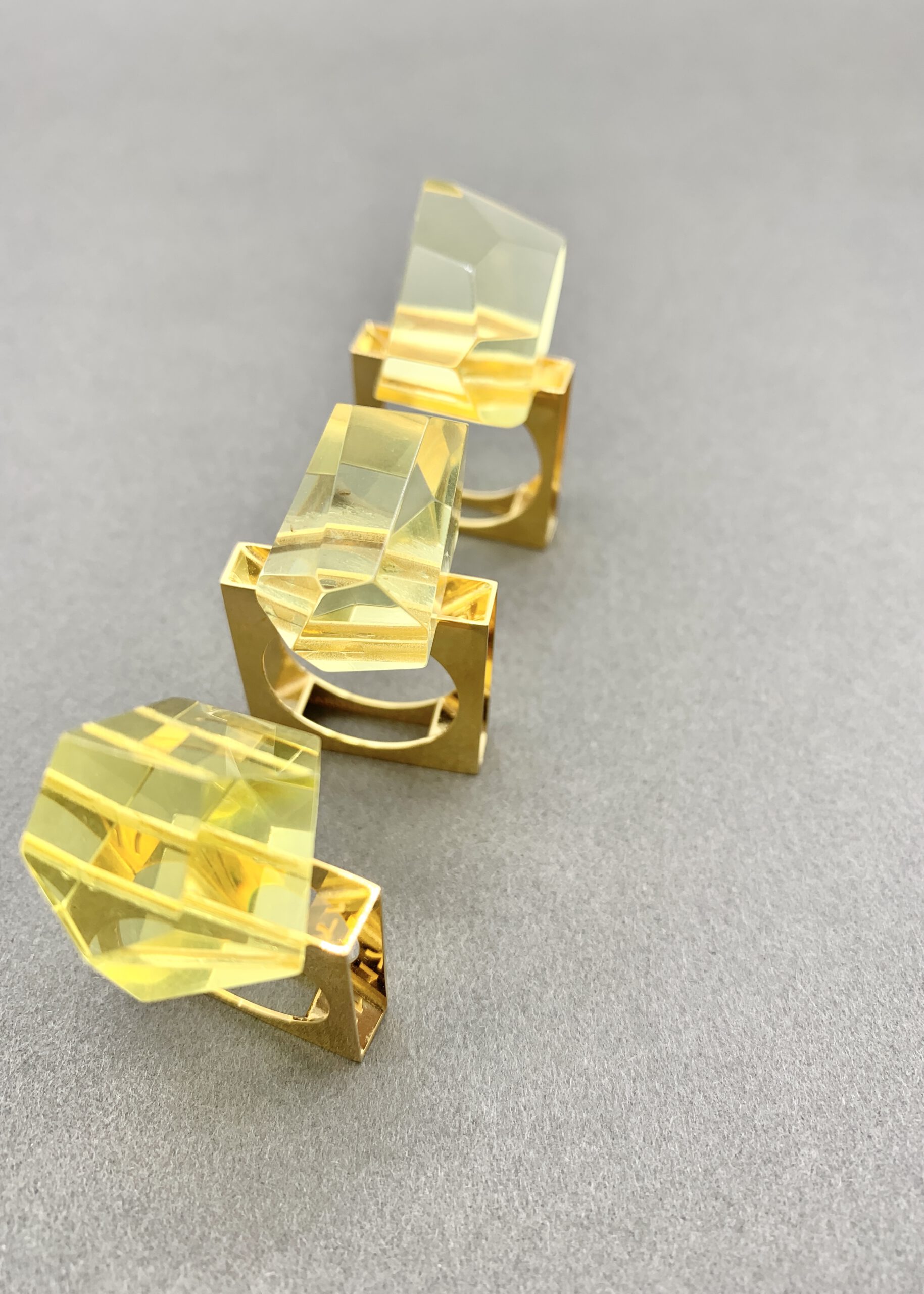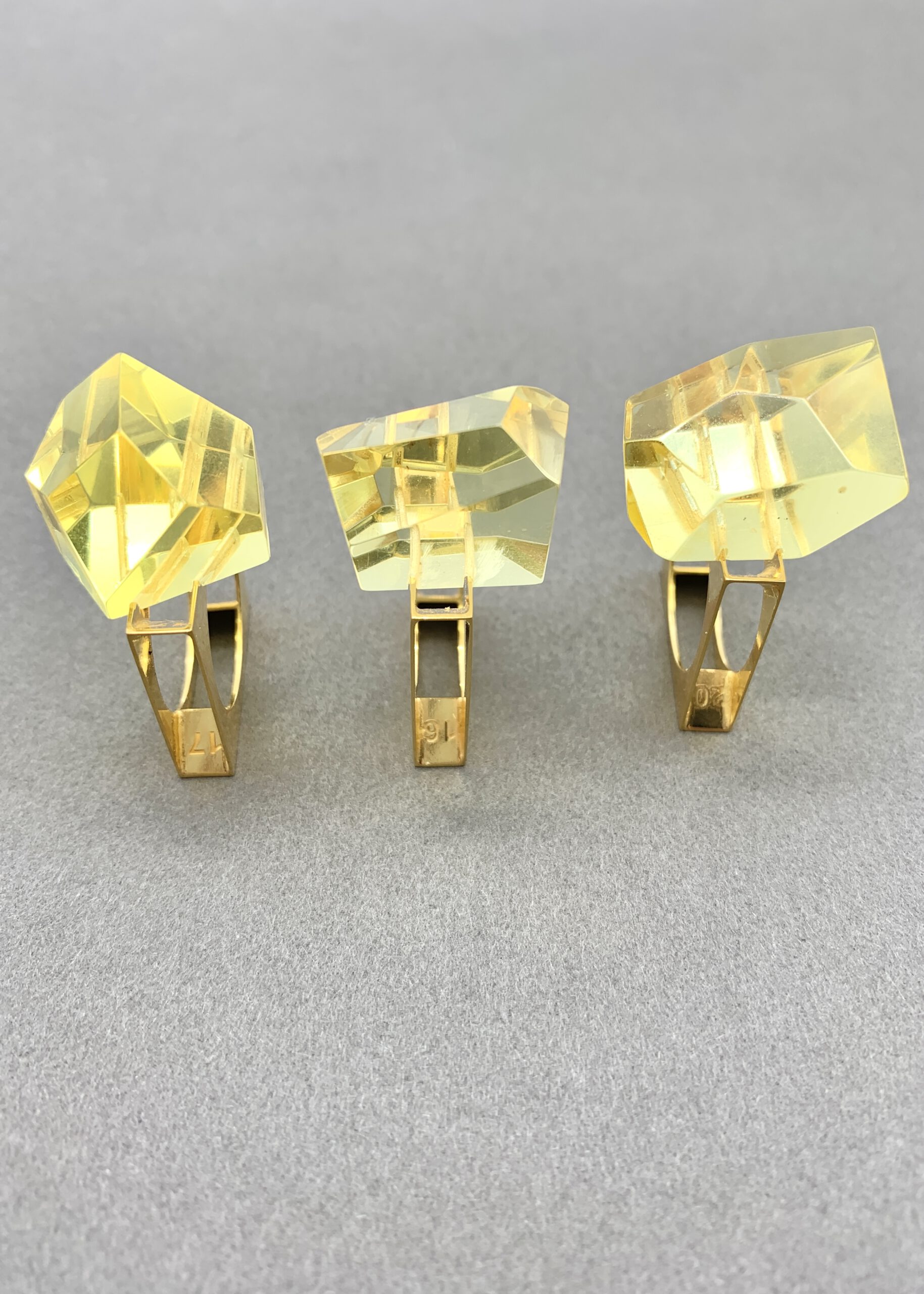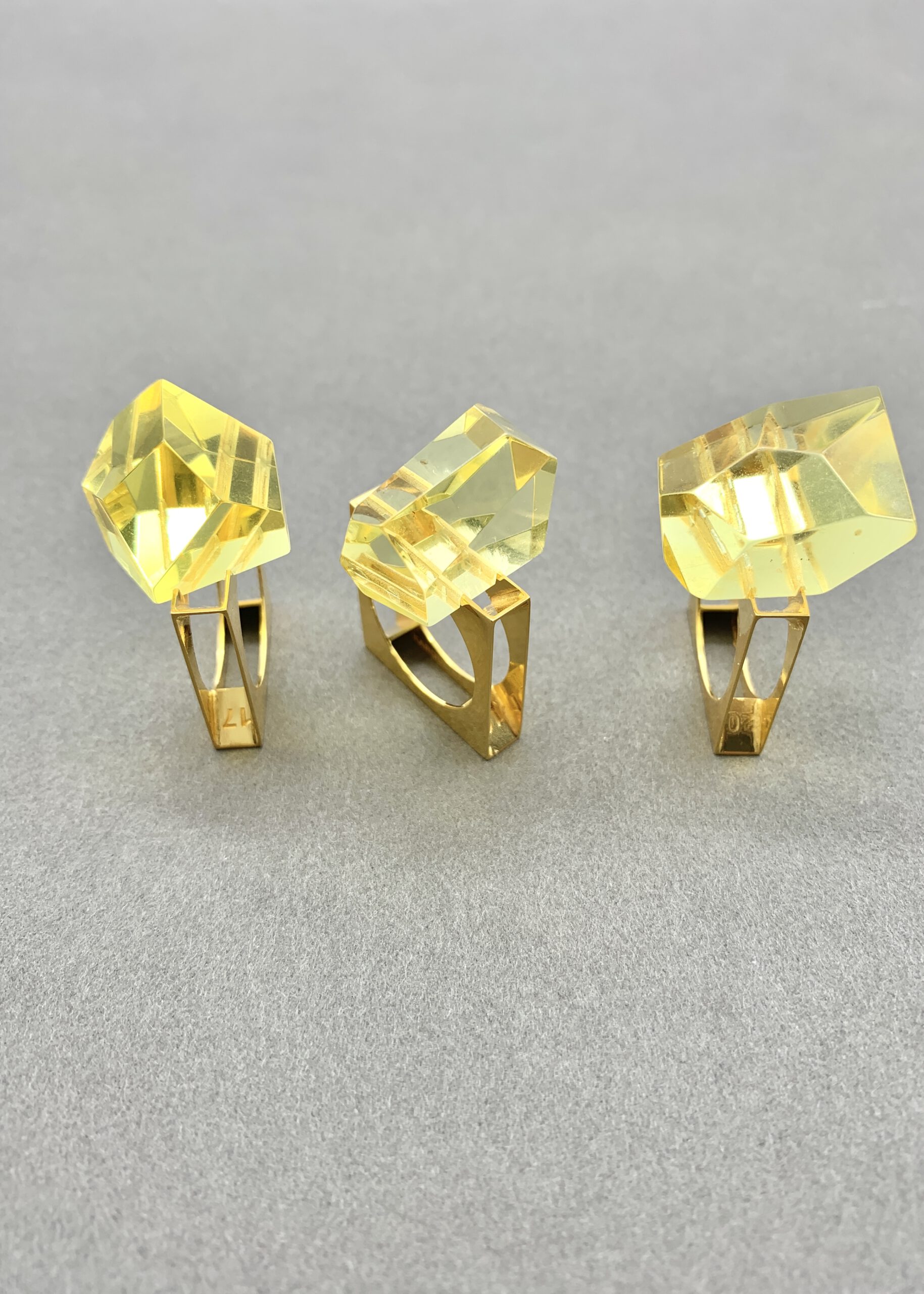 In Silber konstruierter Ring mit einem Bernstein in Diamantenschliff. Man empfindet ihn anders bei jedem Licht. Den Bernsteinring kann man auch zum Kettenanhänger umwandeln, in dem man eine Kette durch die Konstruktion zieht.