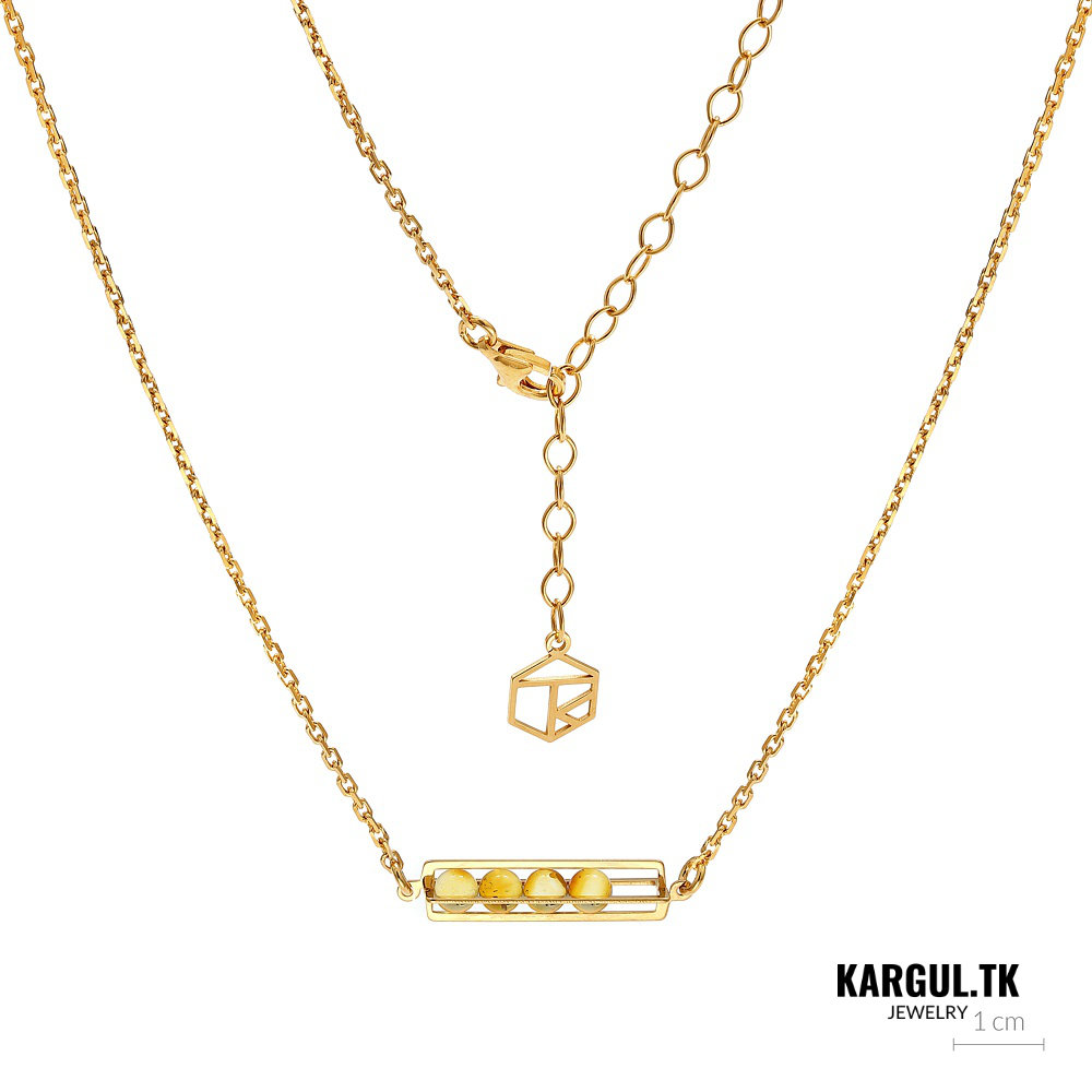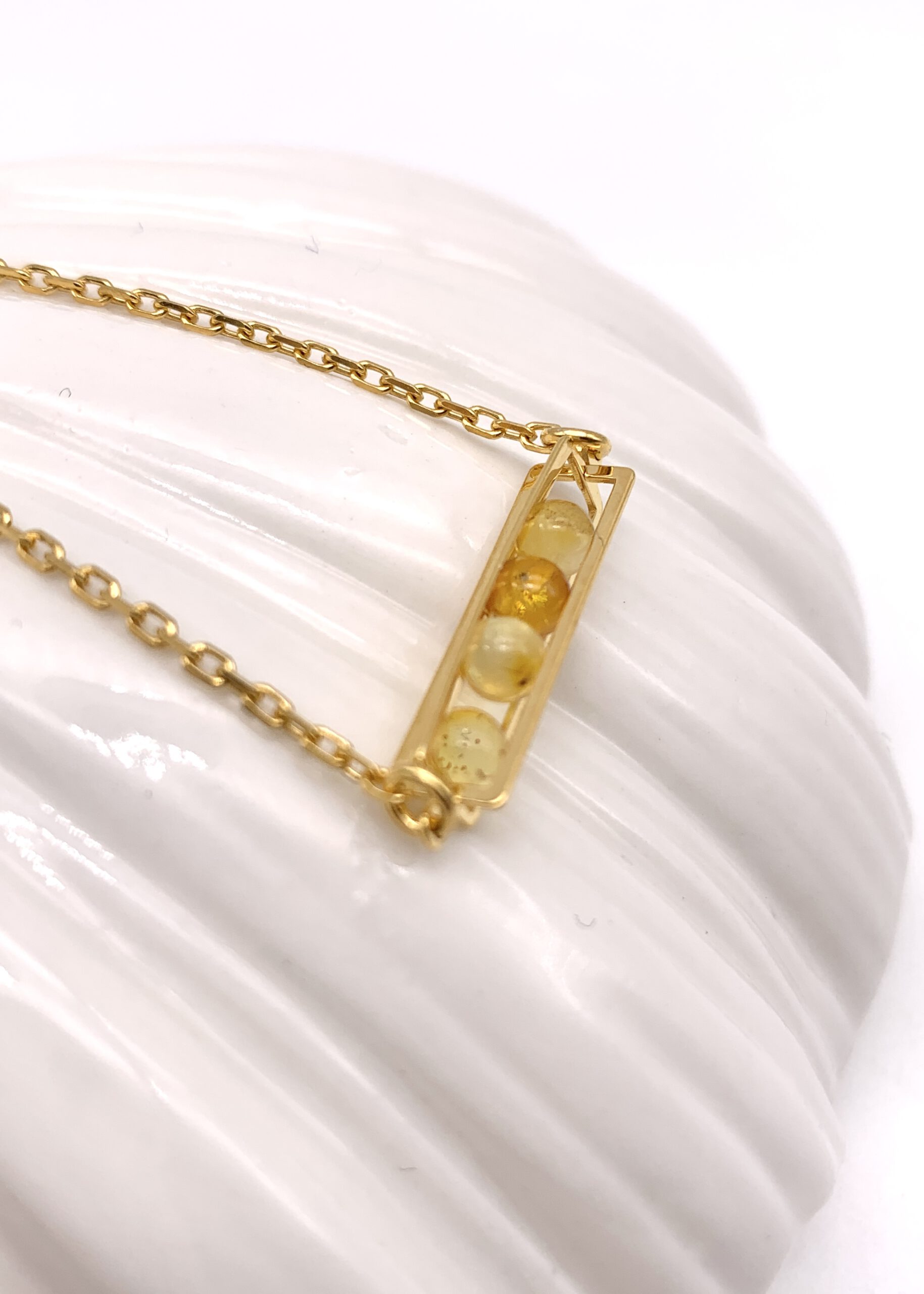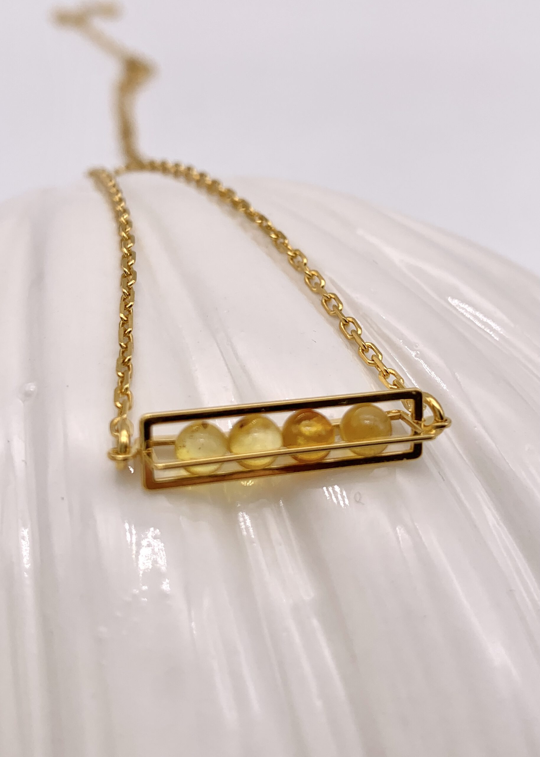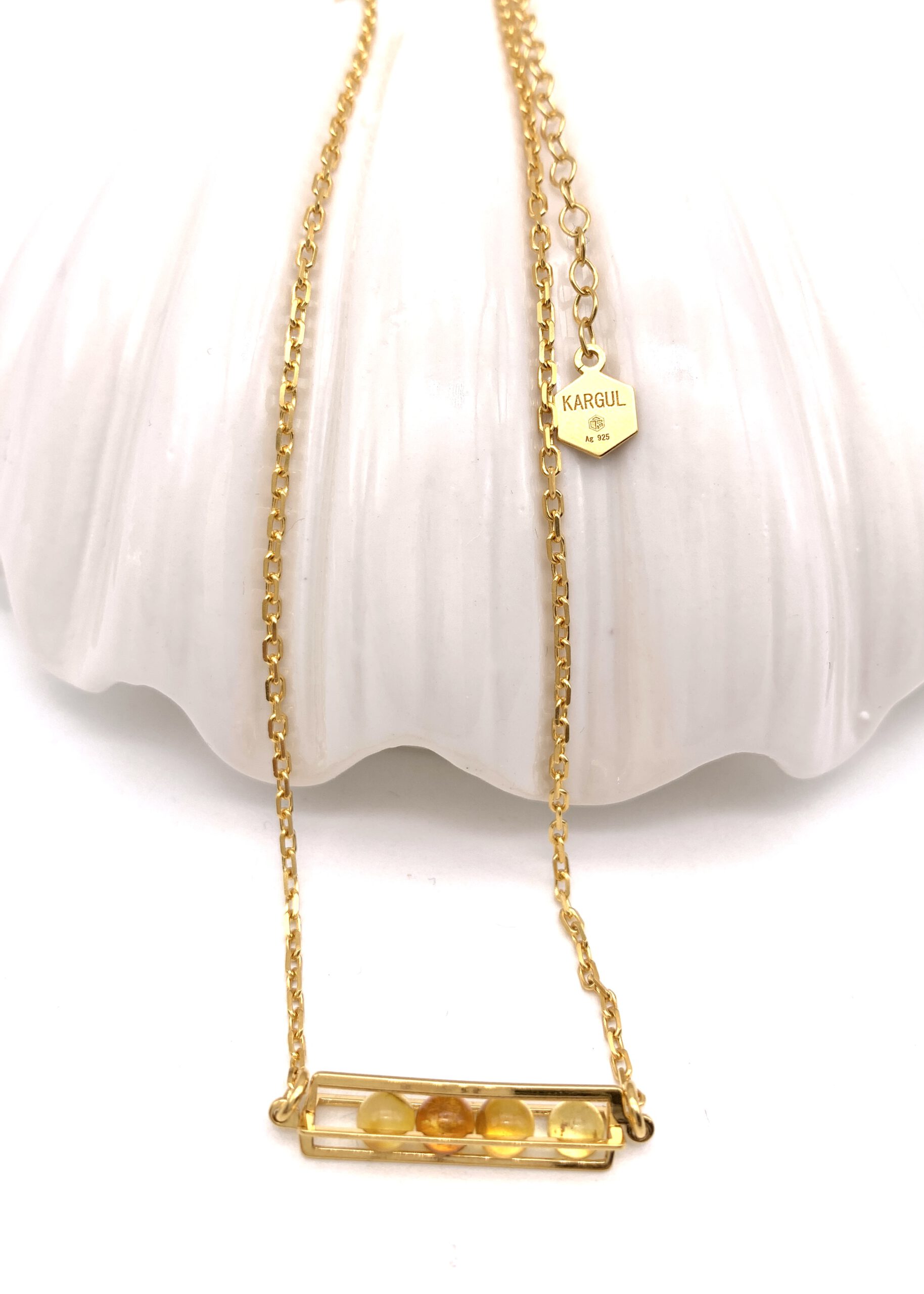 Die Bernsteinkette aus der Serie Fi4 vereint minimalistische Form mit natürlicher Ausdruckskraft. Eine 4 mm große Kugel aus echtem baltischen Bernstein bewegt sich frei in einem filigranen, geometrischen Gestell – ein typisches Merkmal des Kargul Designs.