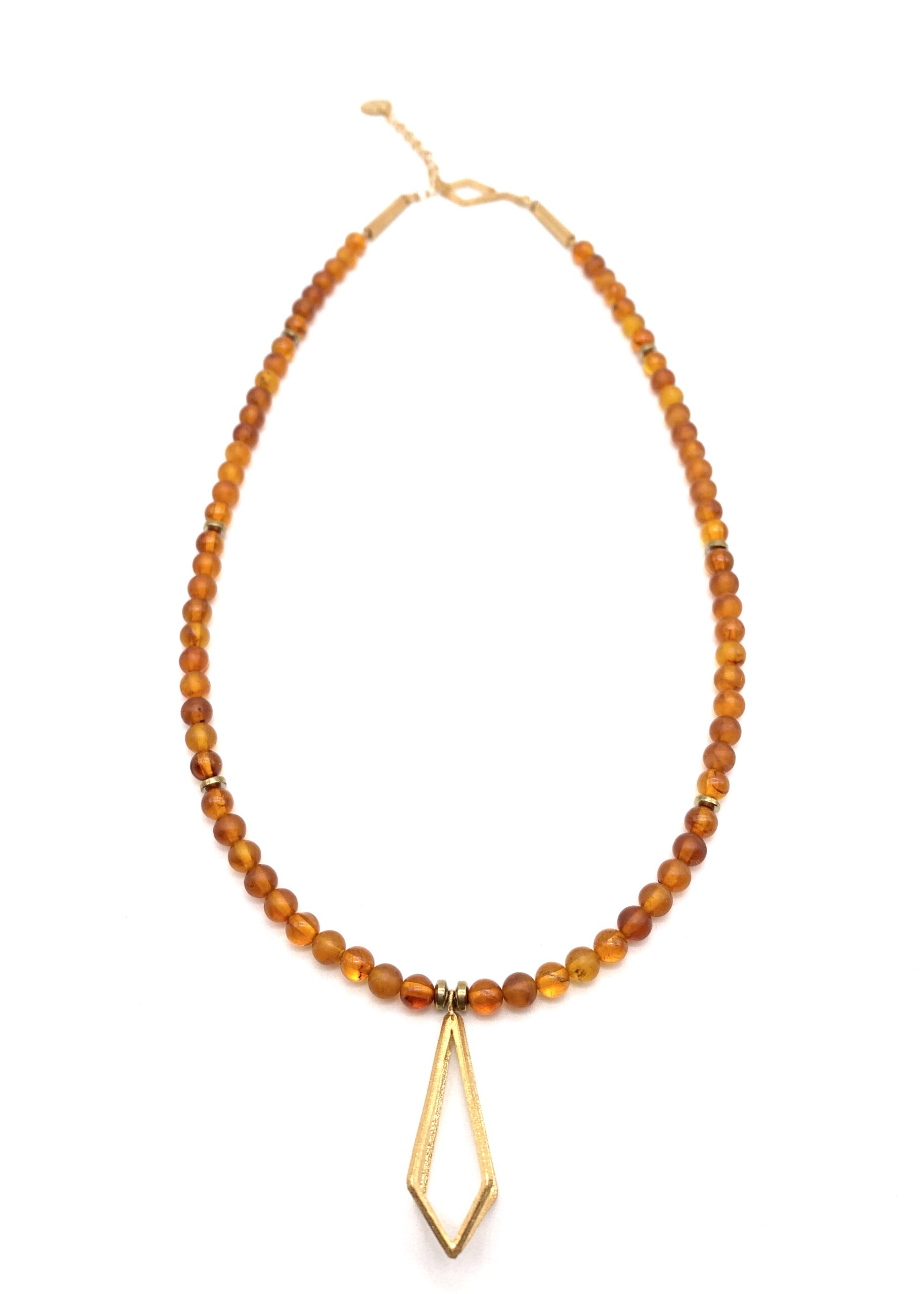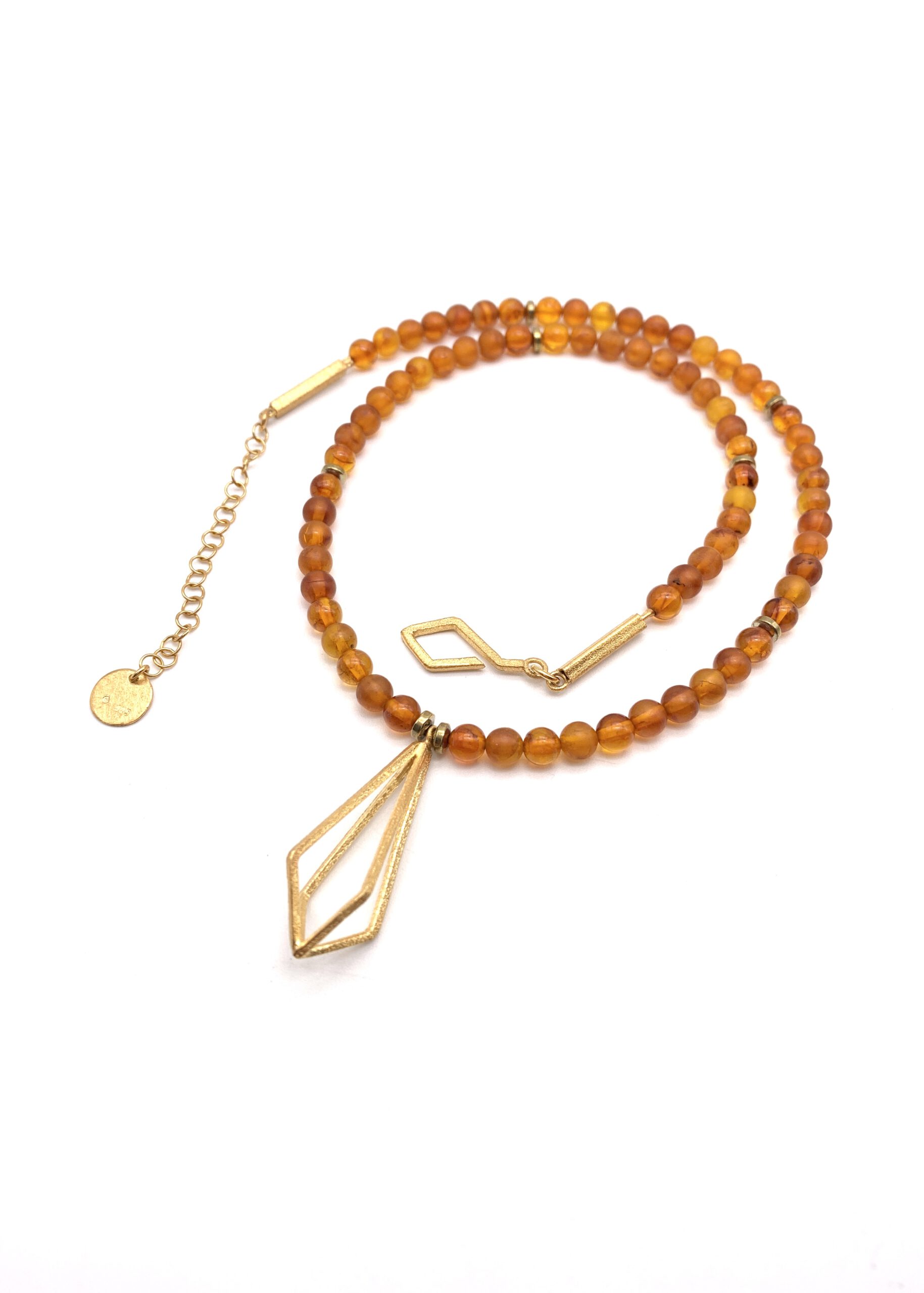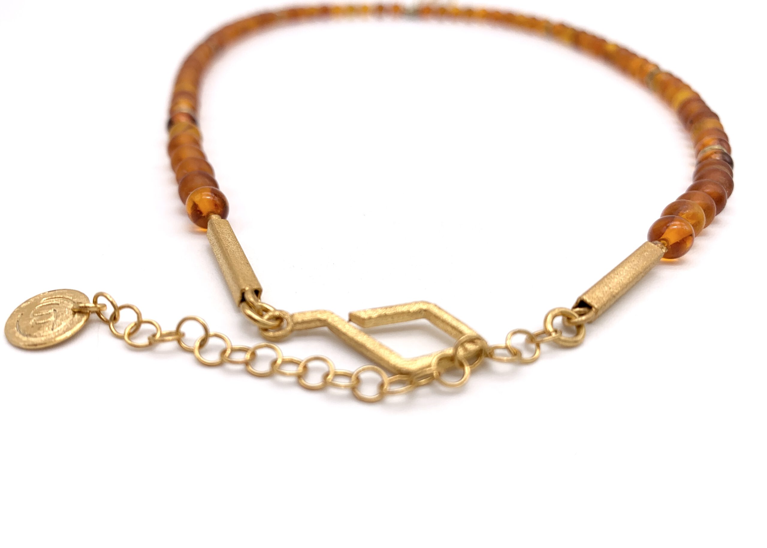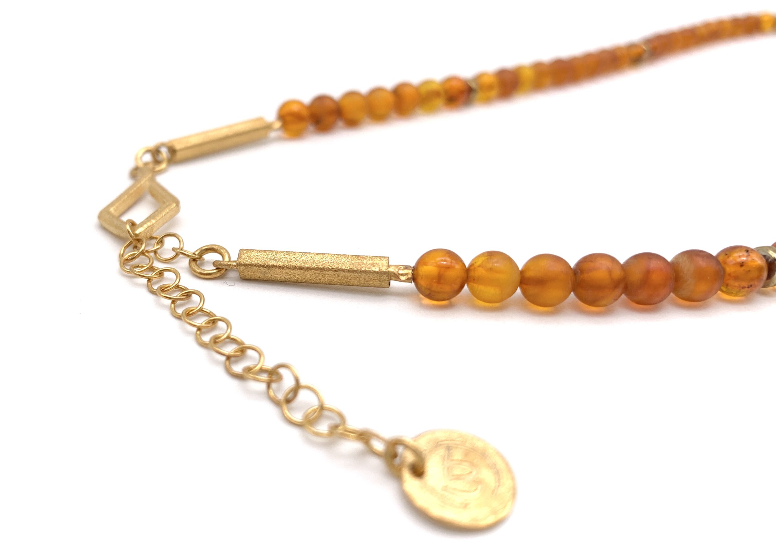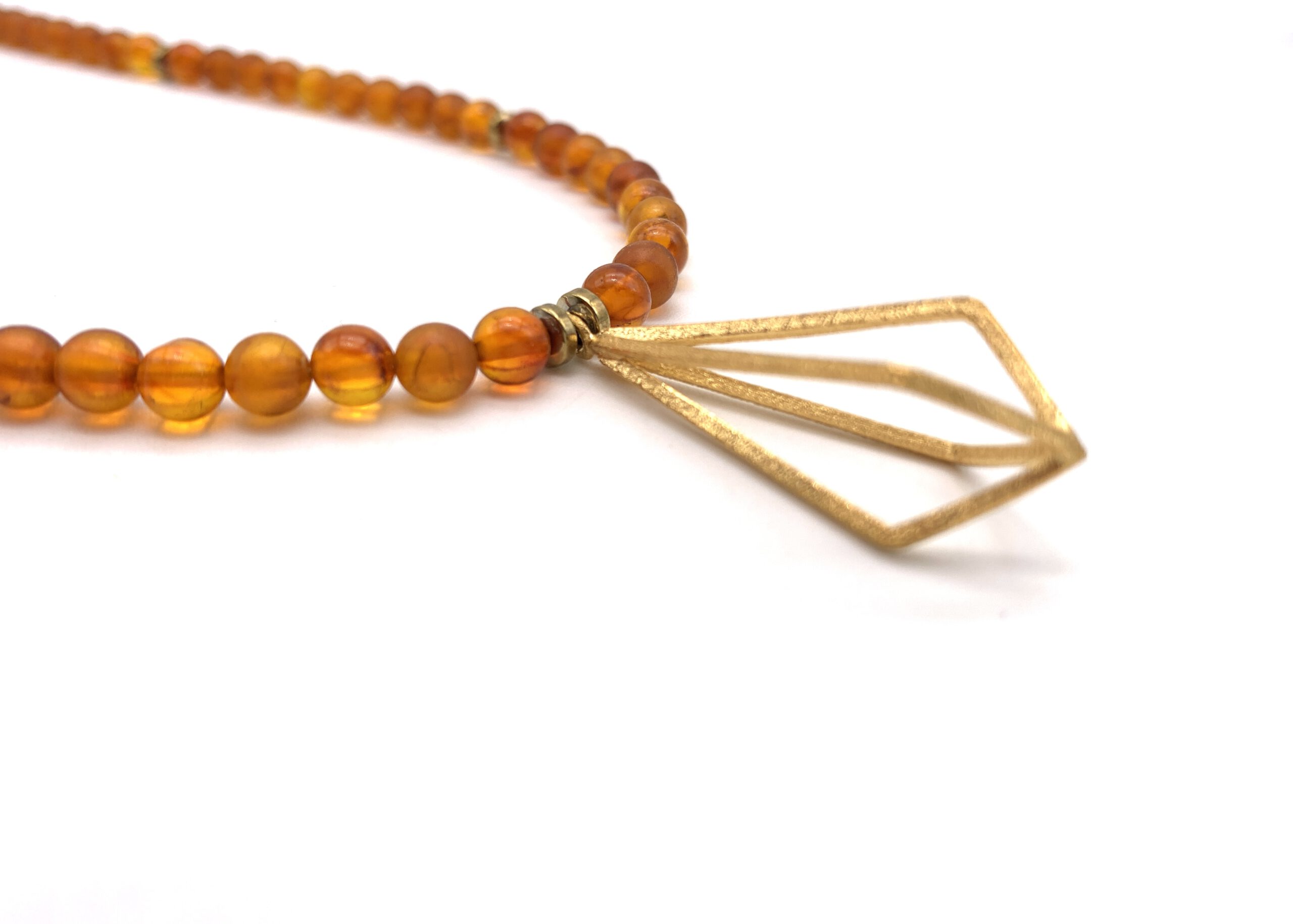 Der geometrische Anhänger sowie die Zwischenelemente sind aus Sterling Silber gefertigt und mit hochwertiger 24-Karat-Vergoldung in mattem Finish veredelt. Die Kombination aus natürlichem Bernstein und edlen Vergoldungsdetails macht diese Kette zu einem modernen und eleganten Blickfang.