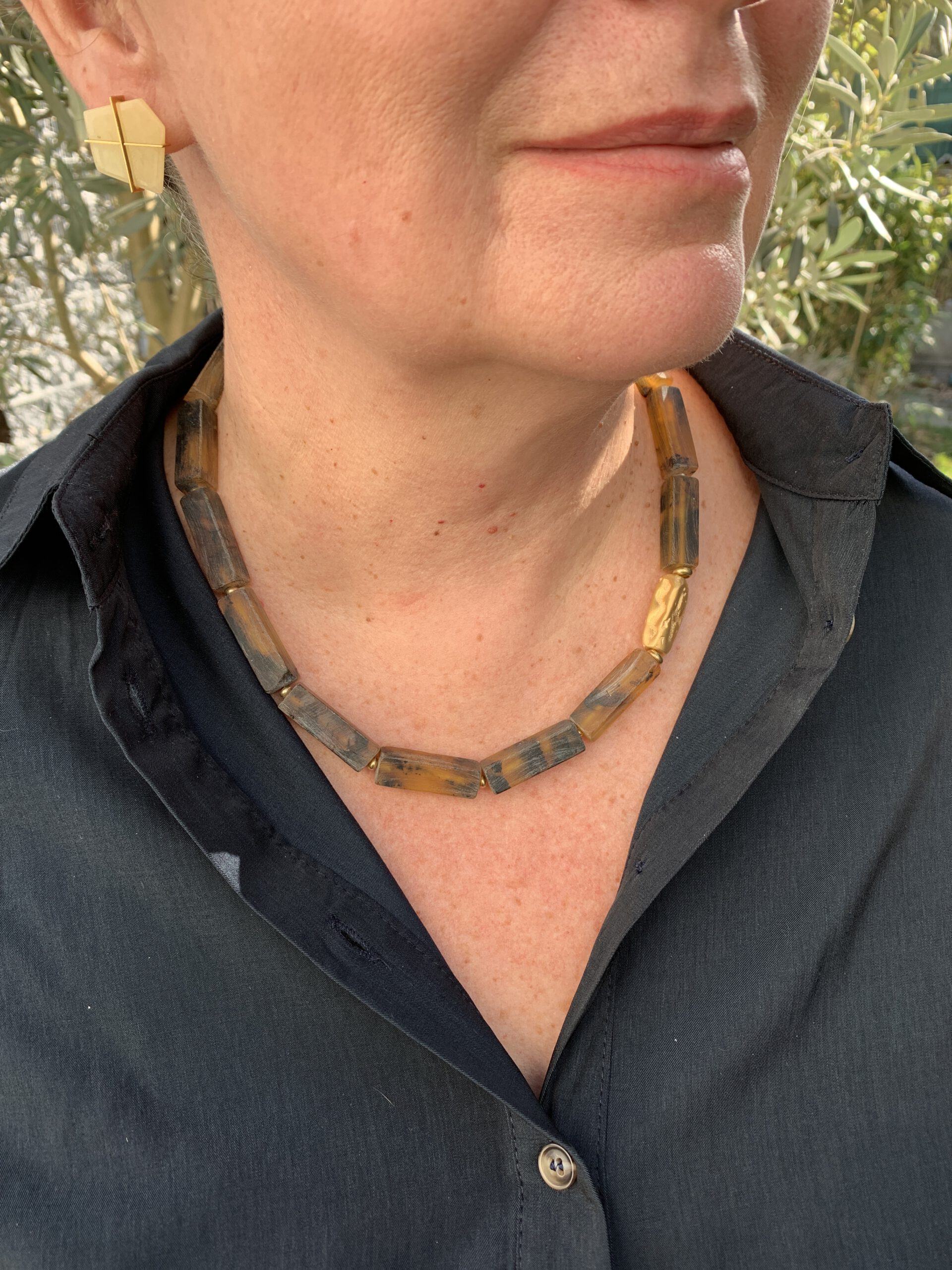 Diese Bernsteinkette modern besticht durch ihre schlichte Eleganz und eine zeitlose Formsprache. Die matten, ungeschliffenen Bernsteinquader fügen sich harmonisch in das Design ein und werden durch mattierte, vergoldete Silberelemente (925er Silber) ergänzt, die die Geometrie des Bernsteins aufgreifen.