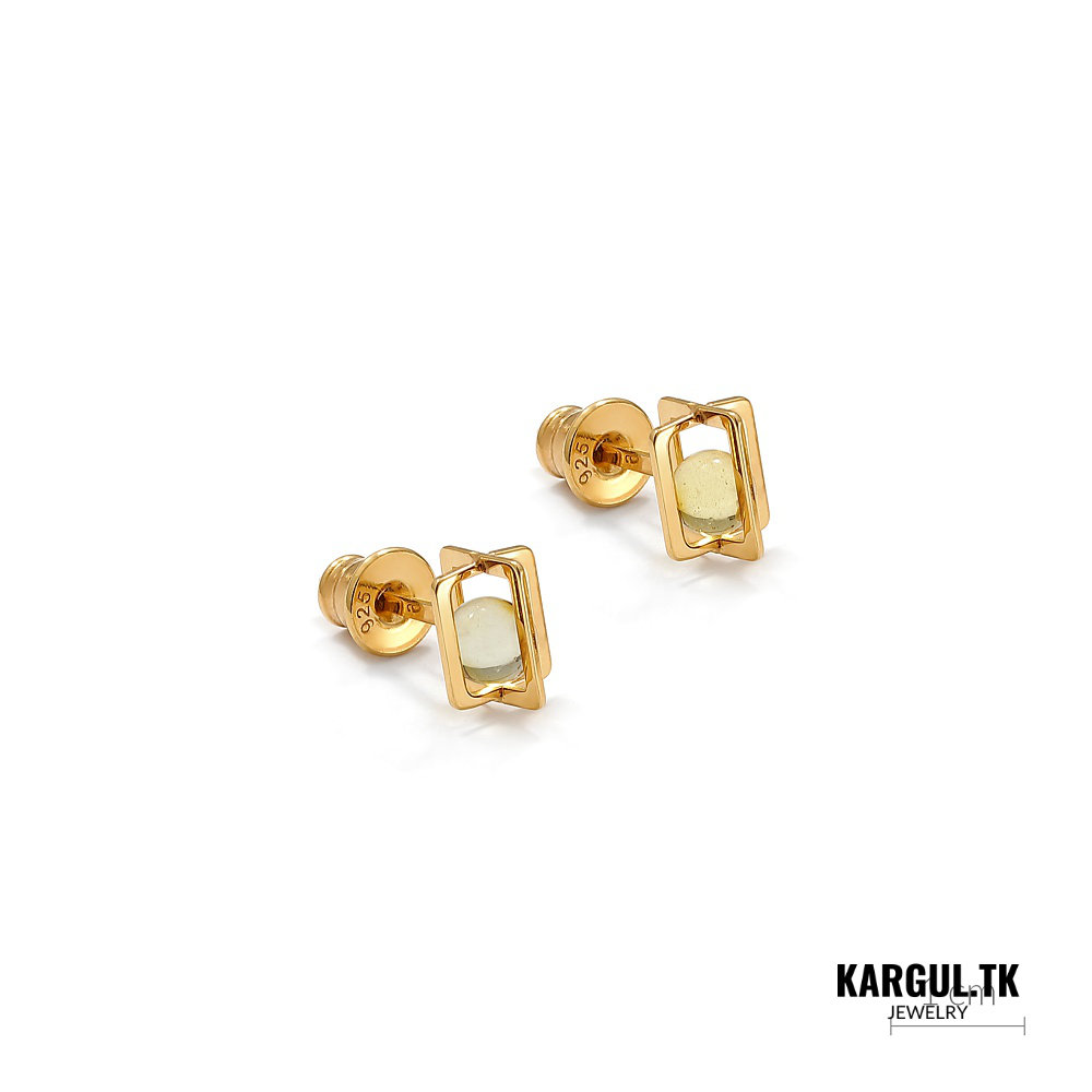 Im Mittelpunkt dieser handgefertigten Bernstein Ohrstecker steht eine 4 mm große Kugel aus echtem Bernstein, die sich frei innerhalb eines filigranen, vergoldeten Quaders bewegen kann.