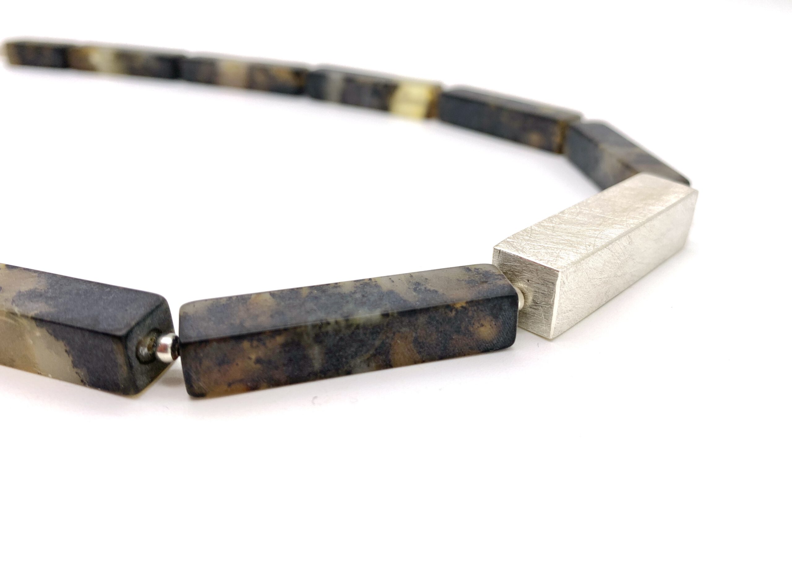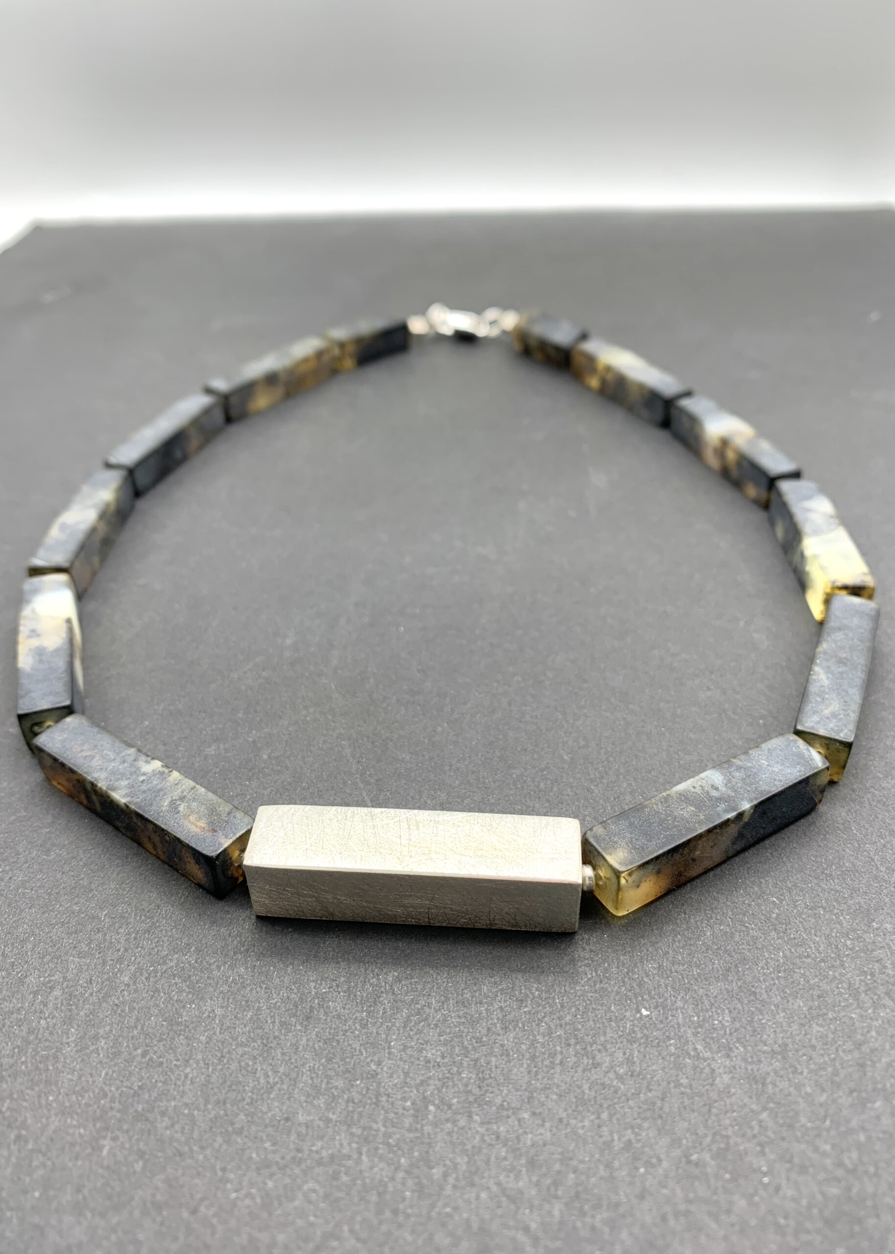 Diese Schwarzer Bernstein Kette besticht durch ihre schlichte Eleganz und moderne Formsprache. Die Kette besteht aus baltischem, unpoliertem Naturbernstein in mattem Schwarz. Die länglichen Quaderperlen betonen die klare Linienführung. In der Mitte setzt ein mattierter Quader aus 925 Sterling-Silber den Akzent – er greift die Form der Bernstein-Elemente auf und schafft Ruhe und Fokus im Design, mit einem modernen Kontrast zwischen warmem, organischem Bernstein und kühlem Silber.